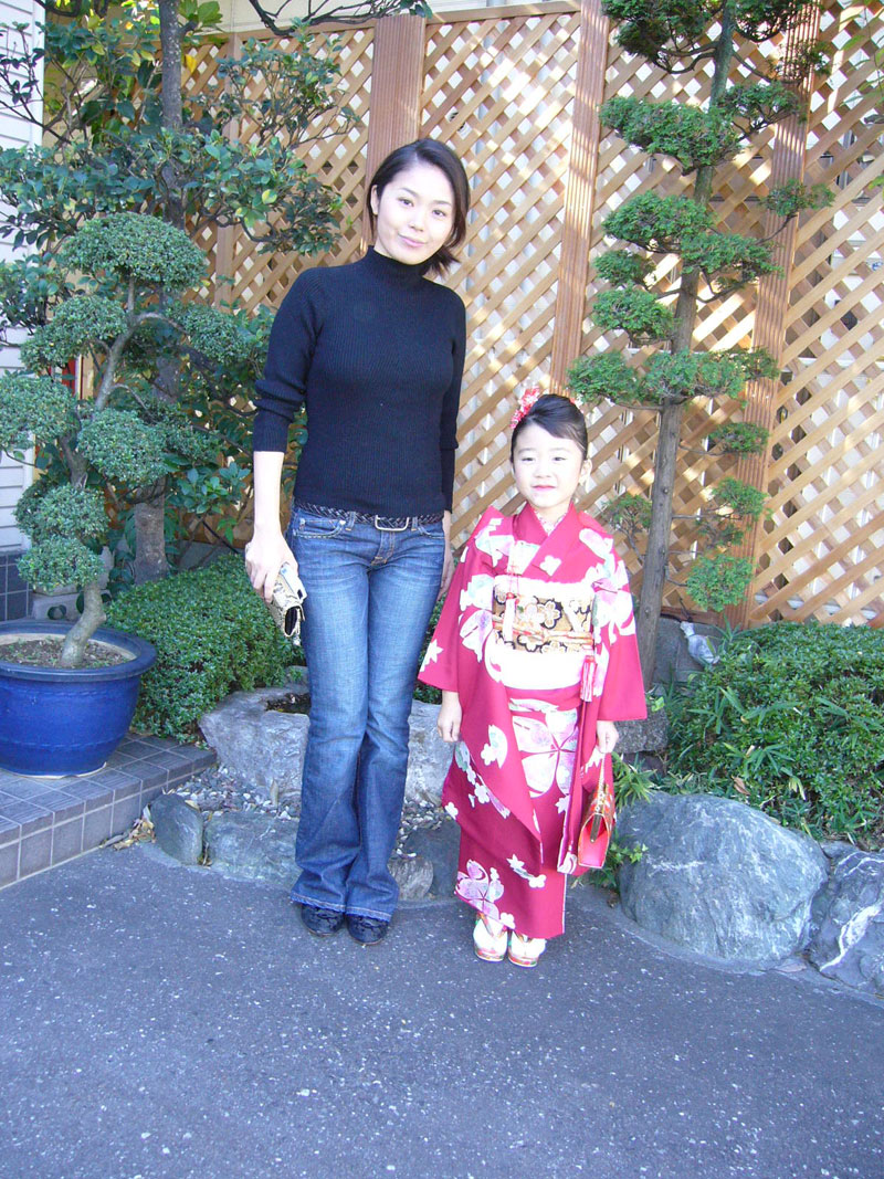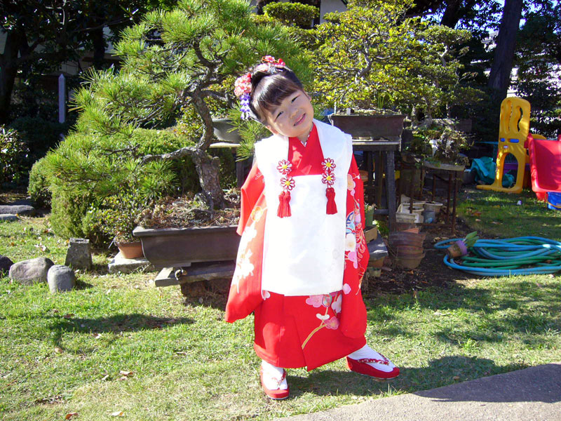 今日は朝からお天気に恵まれ素晴らしい日になりました。朝、早めに美容室で髪を可愛くアップしてもらいおしゃまな三歳の出来上がりです。着物はのしめを利用して肩上げ、腰上げ、袖を丸くして被布を合わせました。美海ちゃんとっても可愛いね。これからも健やかに成長することをお祈りしています。