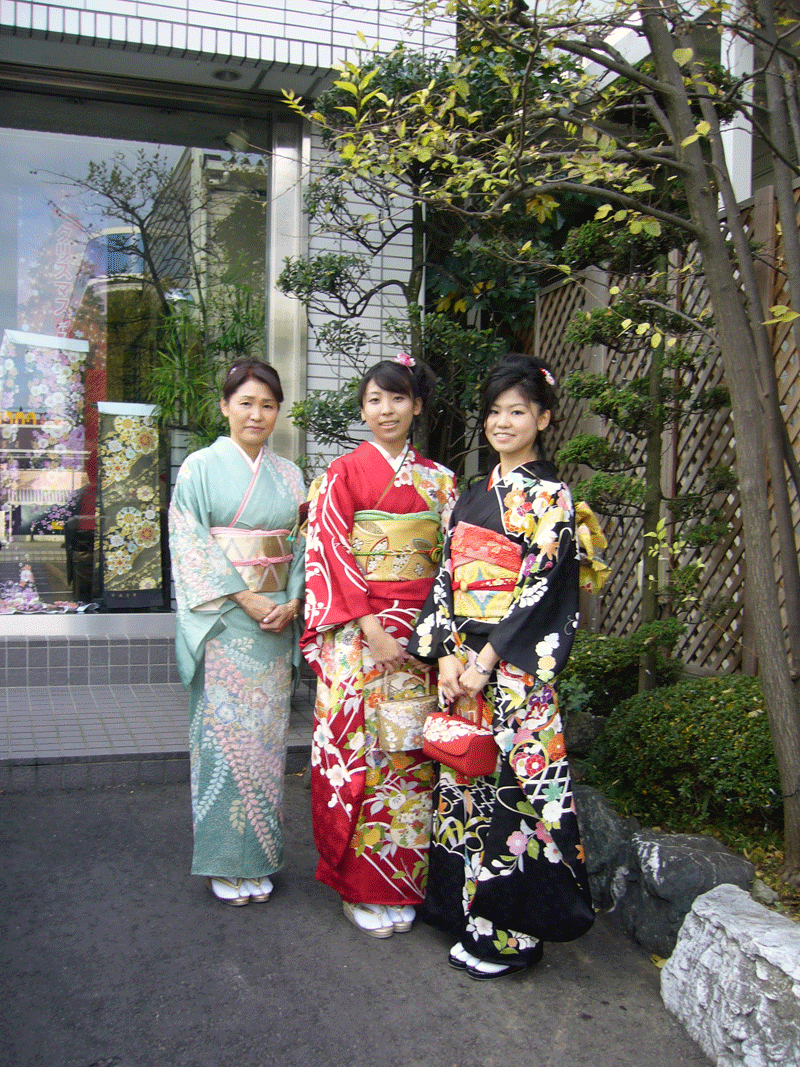 女性人はきもの姿で記念撮影です。姉妹は千總の振袖を着ています。お二人ともとてもお似合いで笑顔が素敵なお嬢様でした。