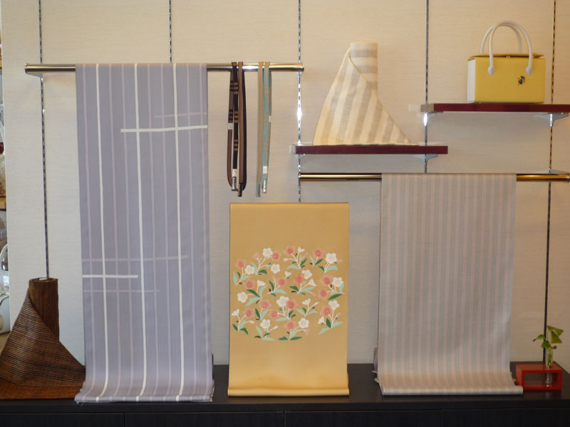 こんな時期を利用して、店内の模様替えをしてみました。一月に京都に注文したお洒落な小紋や塩瀬の帯が、誇らしげに飾られました。