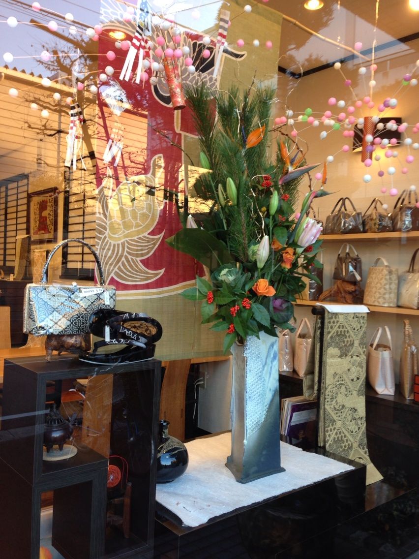 店内の大掃除が終わり花器に正月花飾りをして、正月を迎える準備が整いました。