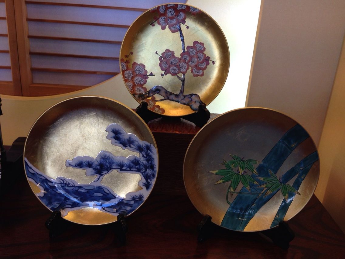こちらの皿も三枚一組になっている松竹梅の絵皿で縁起物として店に飾りました。
