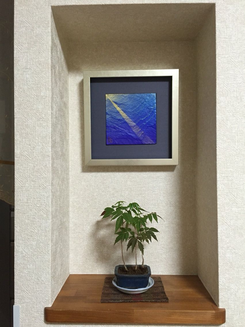 こちらの絵は、宮城の雄勝のスレートを使用した絵で、青い海に太陽の光が、底まで照らすかのような光を放ったパワーをいただける紺碧の絵です。