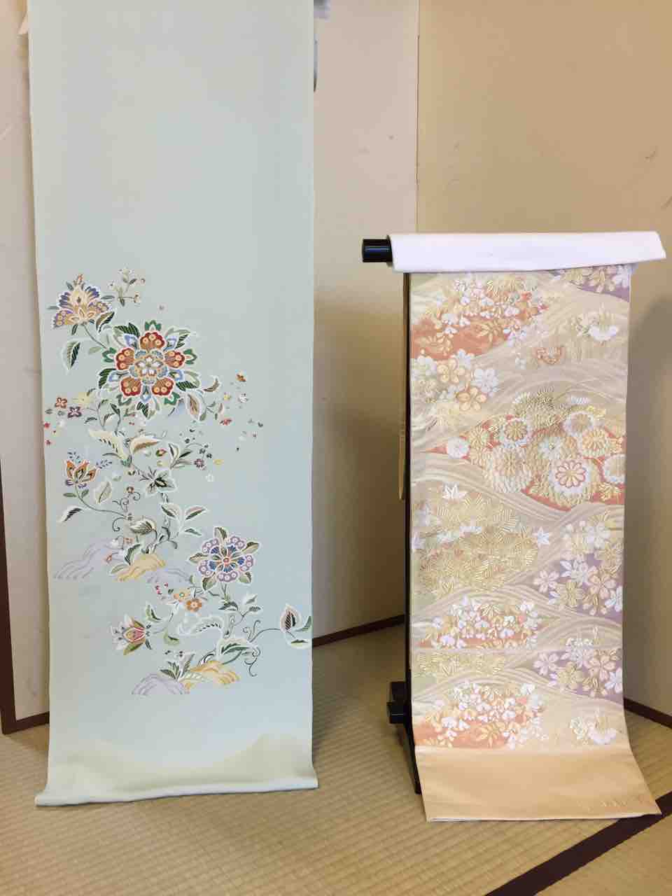 しかし、店内は秋の新作付下げや袋帯が、揃って雨に負けない優雅なディスプレーで飾られています。