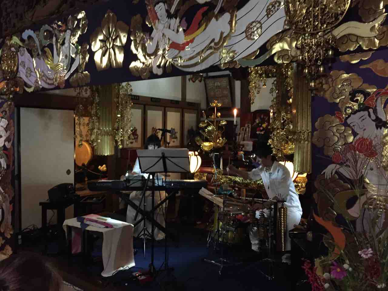 今回で七、八回になるイベントで、本堂に40人から50人ぐらい集まり、幻想的な演奏に耳を傾けて聞き入っています。