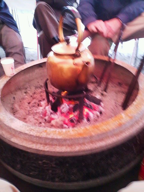 しかし雨がやみそうになく寒さがひどくなってきました。テント内で大火鉢を囲って談笑しながら雨が止むのを待っています。