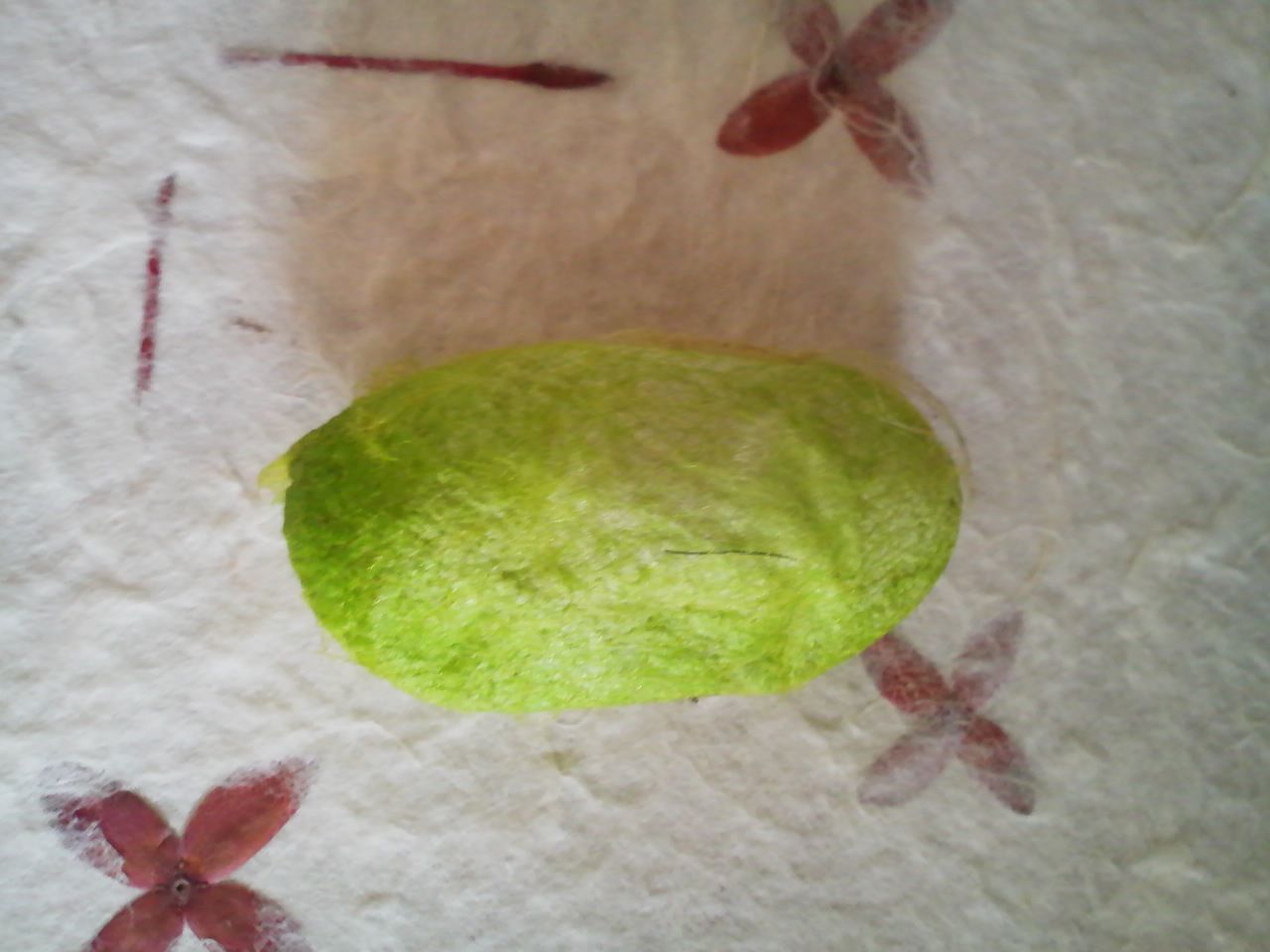 ゴルフ場の中は、クヌギの木が多く見事にレイアウトされた一流のゴルフコースでした。最後のホールにさしかかった時、クヌギの木下に緑が鮮やかな物を見つけ拾い上げてみるとそれは、天然の繭玉でした。拾い上げる行為は、まぎれもなく職業病でしょうね。