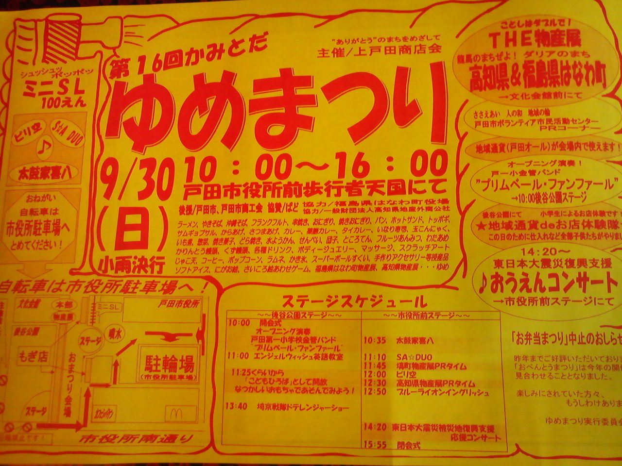 今年もありがとうをめざして上戸田商店会主催ゆめまつりを実施いたします。9月30日日曜日戸田市役所前を歩行者天国にして10時から16時までイベントを開催しますので、ご家族一同でお出かけしてください。